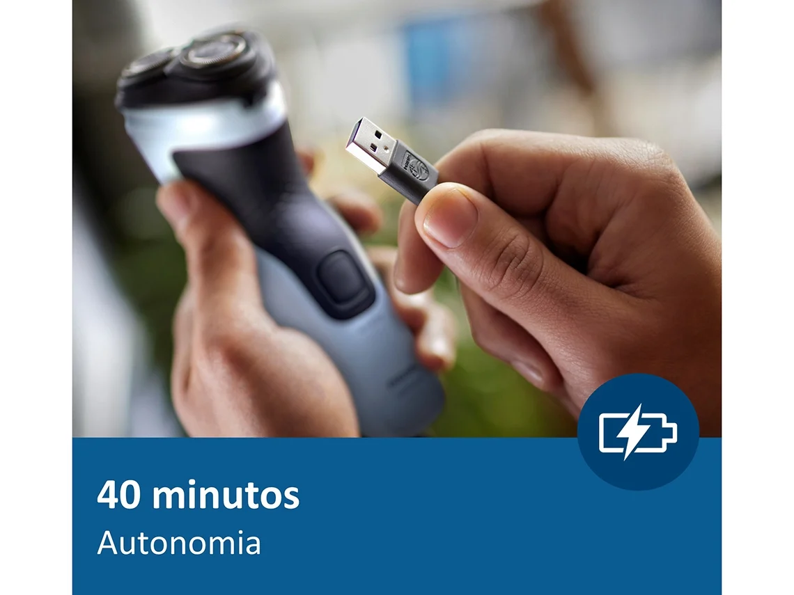 Em apenas uma hora, a bateria de níquelhidreto metálico (NiMH) duradoura está totalmente carregada para cerca de 13 sessões de barbear. E se estiver com pressa? Um carregamento rápido de 5 minutos fornece-lhe energia suficiente para uma sessão de barbear.